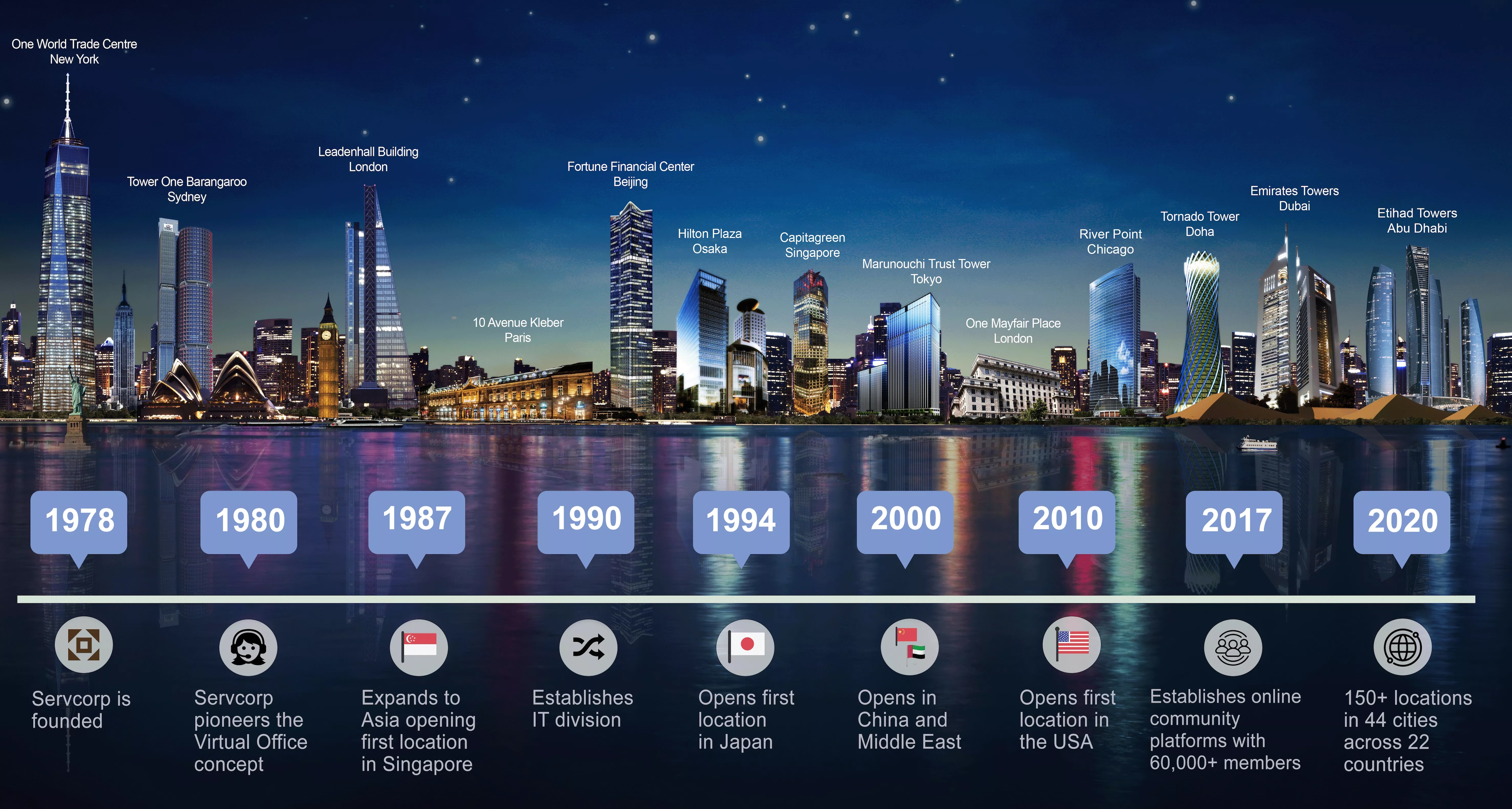 Servcorp was founded in 1978 in Australia by Alfred G. Moufarrige (CEO). As a pioneer of the Service Office and Virtual Office industry, Moufarrige has been working in the flexible workspace industry for over 45 years. Notably, Servcorp is the birthplace of the Virtual Office over 30 years ago. The company went global in 1987 and now has over 150 locations in over 40 cities and 19 countries around the world.